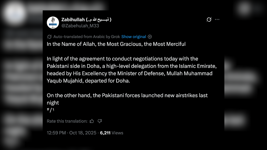 سوشل میڈیا پلیٹ فارم “ایکس” پر جاری بیان میں مجاہد نے کہا جیسا کہ وعدہ کیا گیا تھا کہ پاکستانی فریق کے ساتھ مذاکرات ہوں گے، اسی سلسلے میں امارتِ اسلامی کا ایک اعلیٰ سطحی وفد، وزیرِ دفاع مولوی صاحب محمد یعقوب مجاہد کی قیادت میں، آج دوحہ روانہ ہو گیا ہے۔