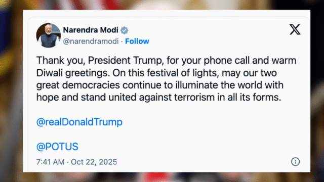 مودی نے بھی ٹرمپ کا فون کال اور دیوالی کی مبارکباد دینے پر شکریہ ادا کیا۔ انہوں نے سوشل میڈیا پلیٹ فارم ایکس پر کہا اس تہوار کے موقع پر، ہماری دو عظیم جمہوریتیں دنیا کو امید کی روشنی دیتے رہیں اور ہر قسم کی دہشت گردی کے خلاف متحد رہیں